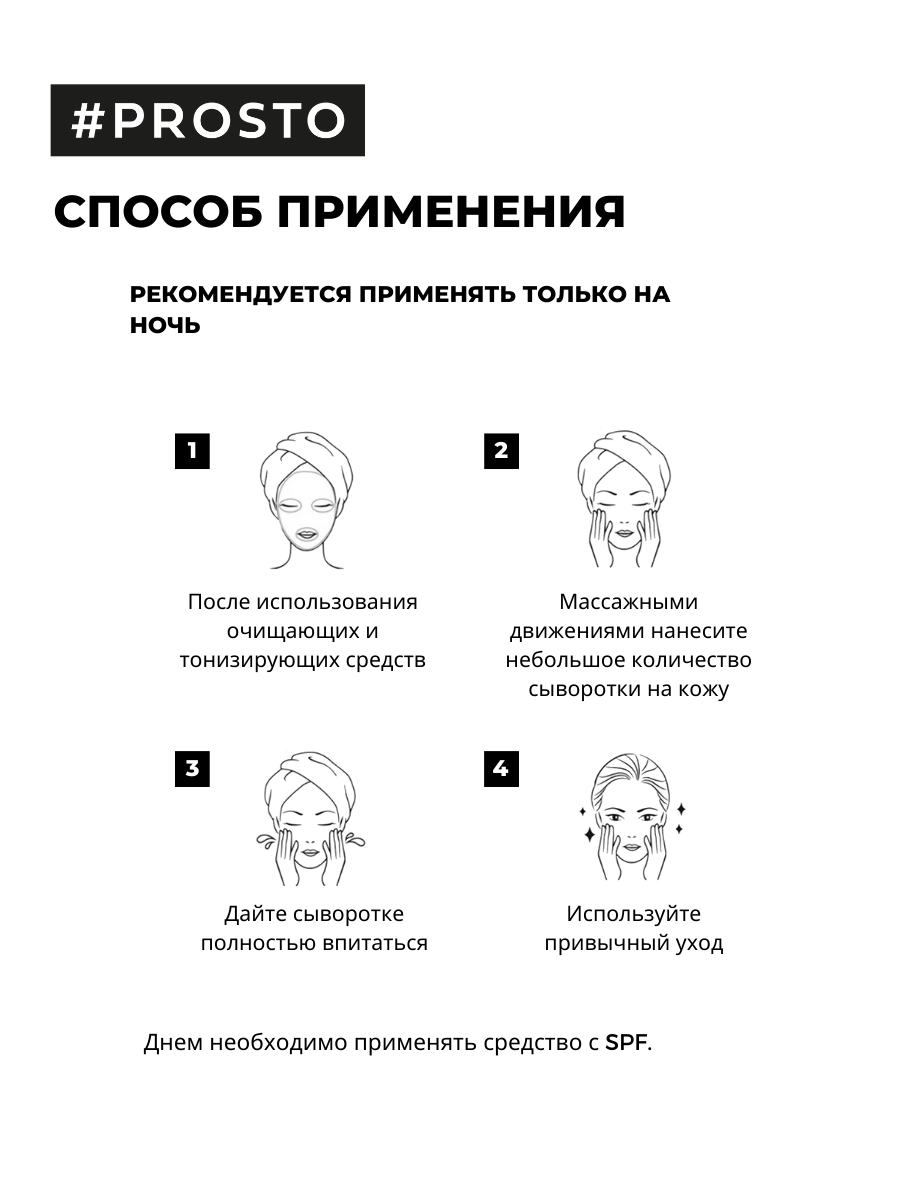 Рекомендуется использовать вечером и обязательно дополнить уход SPF. Нанесите небольшое количество сыворотки массажными движениями на очищенную и тонизированную кожу, дайте полностью впитаться и продолжите уход.