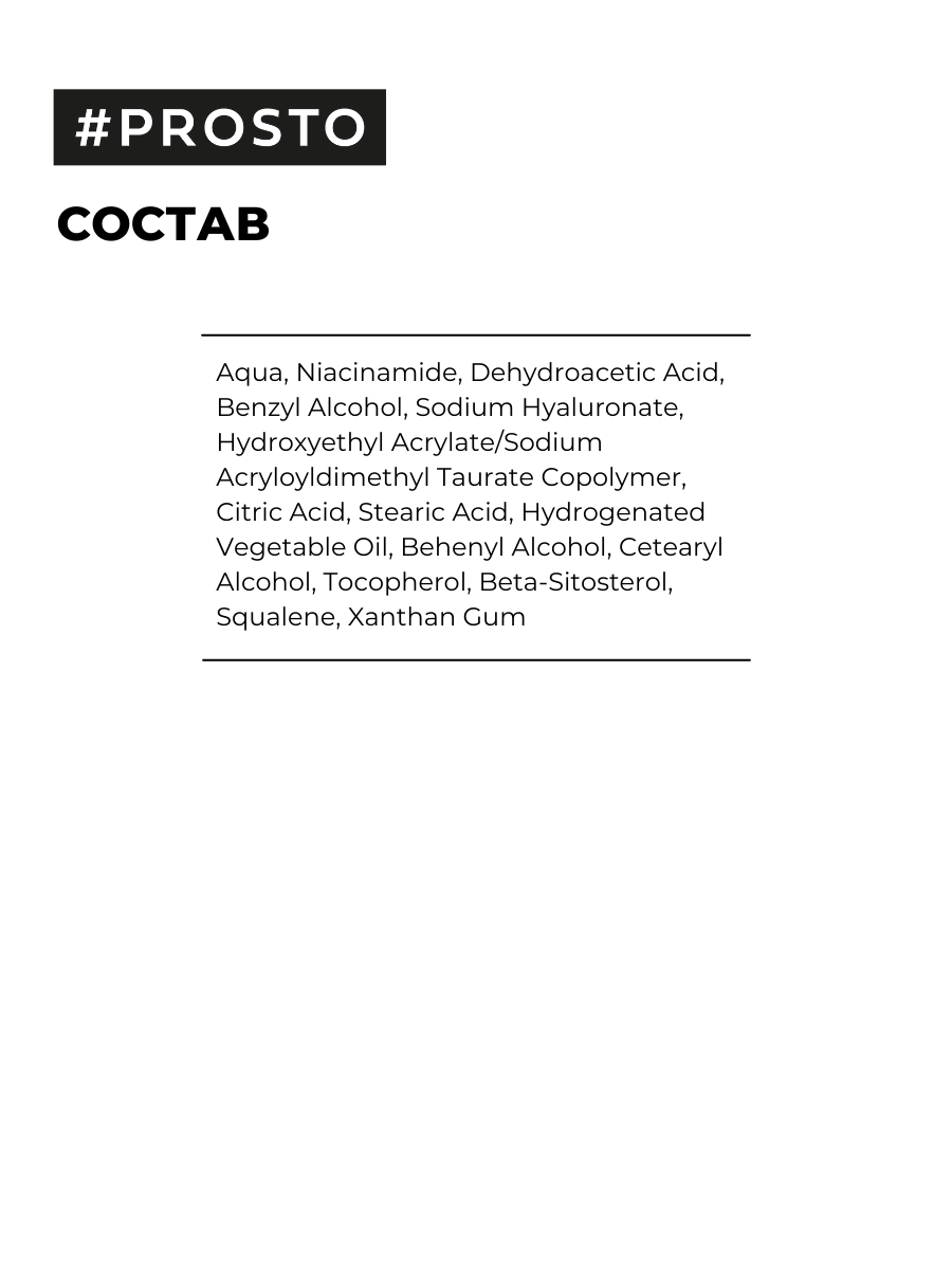 Aqua, Niacinamide, Dehydroacetic Acid, Benzyl Alcohol, Sodium Hyaluronate, Hydroxyethyl Acrylate/Sodium Acryloyldimethyl Taurate Copolymer, Citric Acid, Stearic Acid, Hydrogenated Vegetable Oil, Behenyl Alcohol, Cetearyl Alcohol, Tocopherol, Beta-Sitosterol, Squalene, Xanthan Gum.