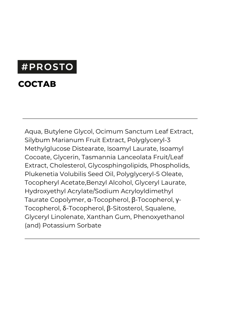 Aqua, Butylene Glycol, Ocimum Sanctum Leaf Extract, Silybum Marianum Fruit Extract, Polyglyceryl-3 Methylglucose Distearate, Isoamyl Laurate, Isoamyl Cocoate, Glycerin, Tasmannia Lanceolata Fruit/Leaf Extract, Cholesterol, Glycosphingolipids, Phospholids, Plukenetia Volubilis Seed Oil, Polyglyceryl-5 Oleate, Tocopheryl Acetate,Benzyl Alcohol, Glyceryl Laurate, Hydroxyethyl Acrylate/Sodium Acryloyldimethyl Taurate Copolymer, Tocopherol, Tocopherol, Tocopherol, Tocopherol, Sitosterol, Squalene, Glyceryl Linolenate, Xanthan Gum, Phenoxyethanol (and) Potassium Sorbate